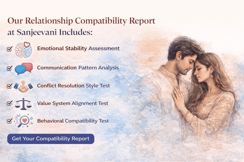 Through our sanjeevani pre marriage compatibility test and psychological compatibility test before marriage, we provide a structured compatibility report that highlights emotional stability, behavioral compatibility, and long-term relationship alignment. This scientific way to check marriage compatibility reduces blind risk.
