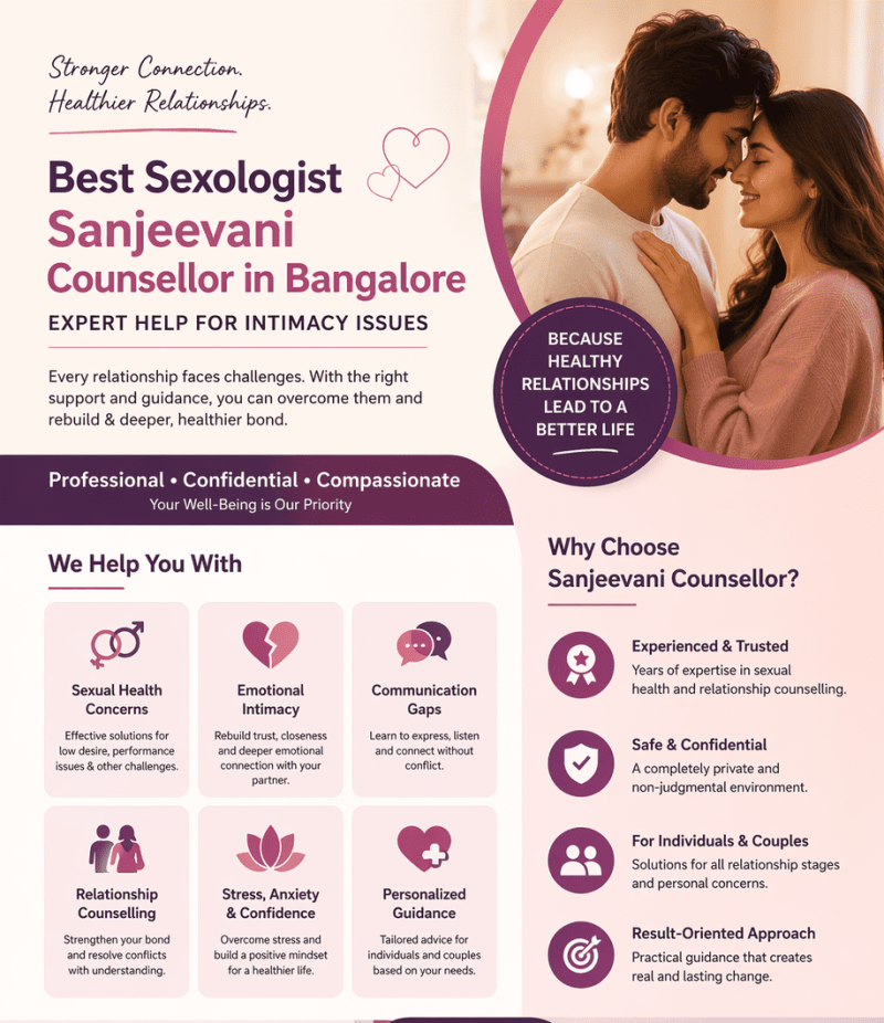 When couples face difficulties in their sexual or emotional connection, reaching out to a trusted expert becomes essential. Sanjeevani Counsellor, widely regarded as the best sexologist in Bangalore, provides a safe and non-judgmental environment where individuals and couples can openly discuss their concerns. With a deep understanding of human psychology, relationships, and sexual wellness, Sanjeevani helps address issues like lack of desire, performance anxiety, emotional disconnect, and communication gaps. As a top sexologist Bangalore, the approach focuses not only on physical aspects but also on emotional healing, making it easier for couples to rebuild trust and intimacy. Whether you are searching for a sex doctor in Bangalore or a male sexual health specialist Bangalore, professional counselling ensures that your concerns are handled with confidentiality and care, especially for those looking for localized support like a sexologist in BTM Layout.